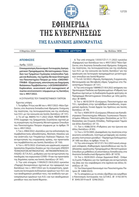 Το Τμήμα Γεωλογίας ως επισπεύδoν Τμήμα μαζί με το συνεργαζόμενο Τμήμα Βιολογίας, της Σχολής Θετικών Επιστημών του Πανεπιστημίου Πατρών, ανακοινώνουν την προκήρυξη δεκαπέντε (15) θέσεων μεταπτυχιακών φοιτητών στο πλαίσιο λειτουργίας του Διατμηματικού Προγράμματος Μεταπτυχιακών Σπουδών (Δ.Π.Μ.Σ.) στην «ΩΚΕΑΝΟΓΡΑΦΙΑ – Eξερεύνηση, αποτύπωση και διαχείριση θαλάσσιου περιβάλλοντος» σύμφωνα με το ΦΕΚ 1414/4.3.2024/τ. B΄).